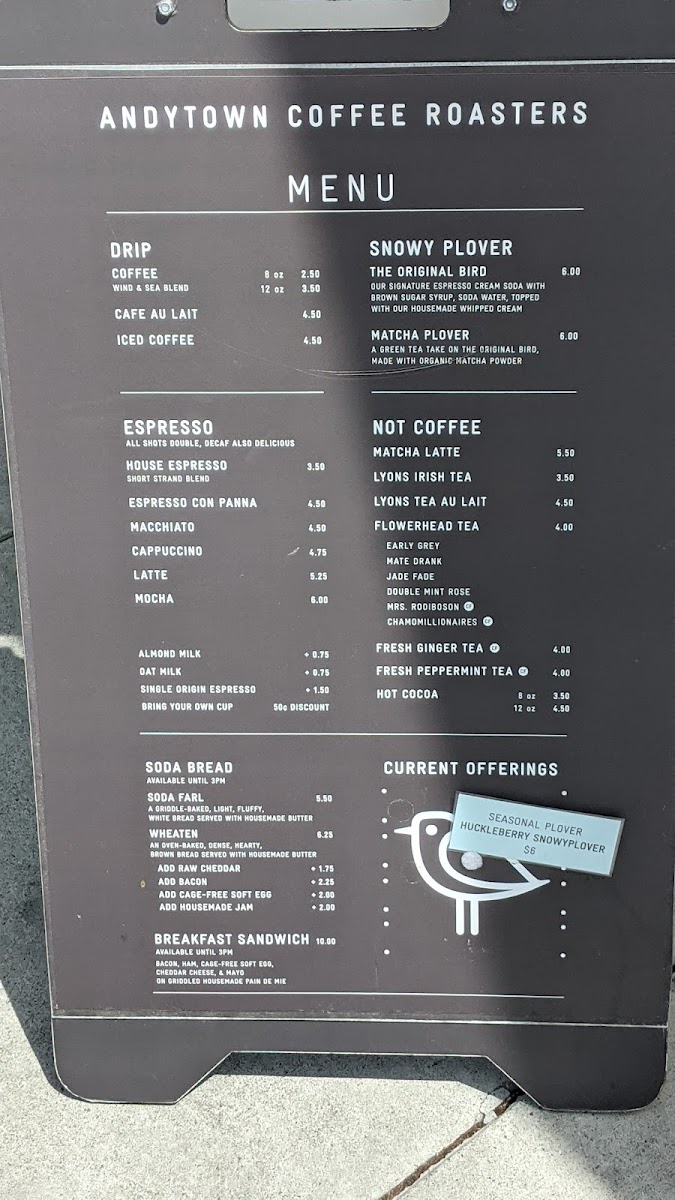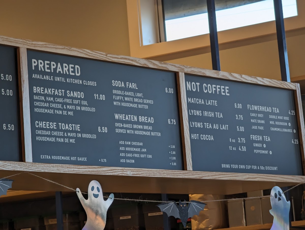 Whether you're stopping by for a morning pick-me-up or a quiet afternoon moment, you’ll find drinks like cappuccinos, cold brews, and seasonal specials such as the Pumpkin Spice Snowy Plover to suit the occasion. The food menu features comforting options like fresh scones, including pumpkin chocolate or savory squash varieties, alongside housemade sandwiches and hearty wheaten bread served with seasonal spreads.